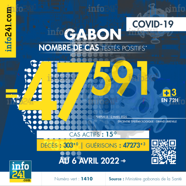 Bilan épidémiologique du Gabon au 6 avril 2022 : 3 nouveaux cas enregistrés en 72h dans l’Ogooué-Maritime sur 702 tests effectués également dans les provinces de l’Estuaire, du Haut-Ogooué et de l’Ogooué-Lolo. Il y a eu aucun nouveau décès et 3 nouvelles guérisons.